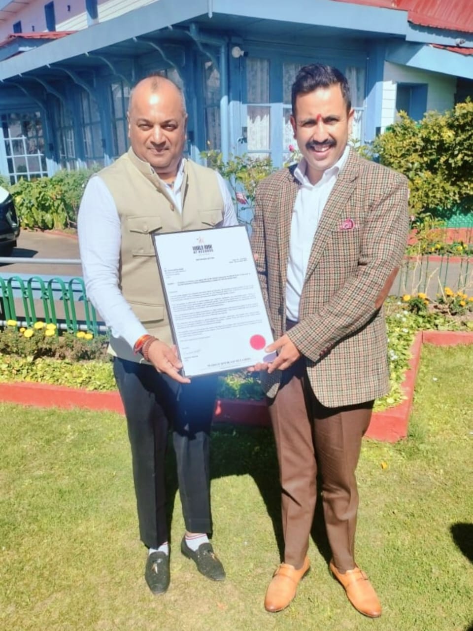सुमित सिंगला ने बताया कि वर्ल्ड बुक ऑफ़ रिकॉर्ड यू के लंदन द्वारा राजा विक्रमादित्य सिंह को हिमाचल प्रदेश में अपने पिता के स्व. राजा वीरभद्र सिंह के गत 40 वर्षों के समय काल में किये गए विकास कार्यों को जारी रखते हुए मौजूदा समय में भी राज्य के विकास कार्य करने उनकी कर्मठता को देखते प्रदान किया जा रहा है.